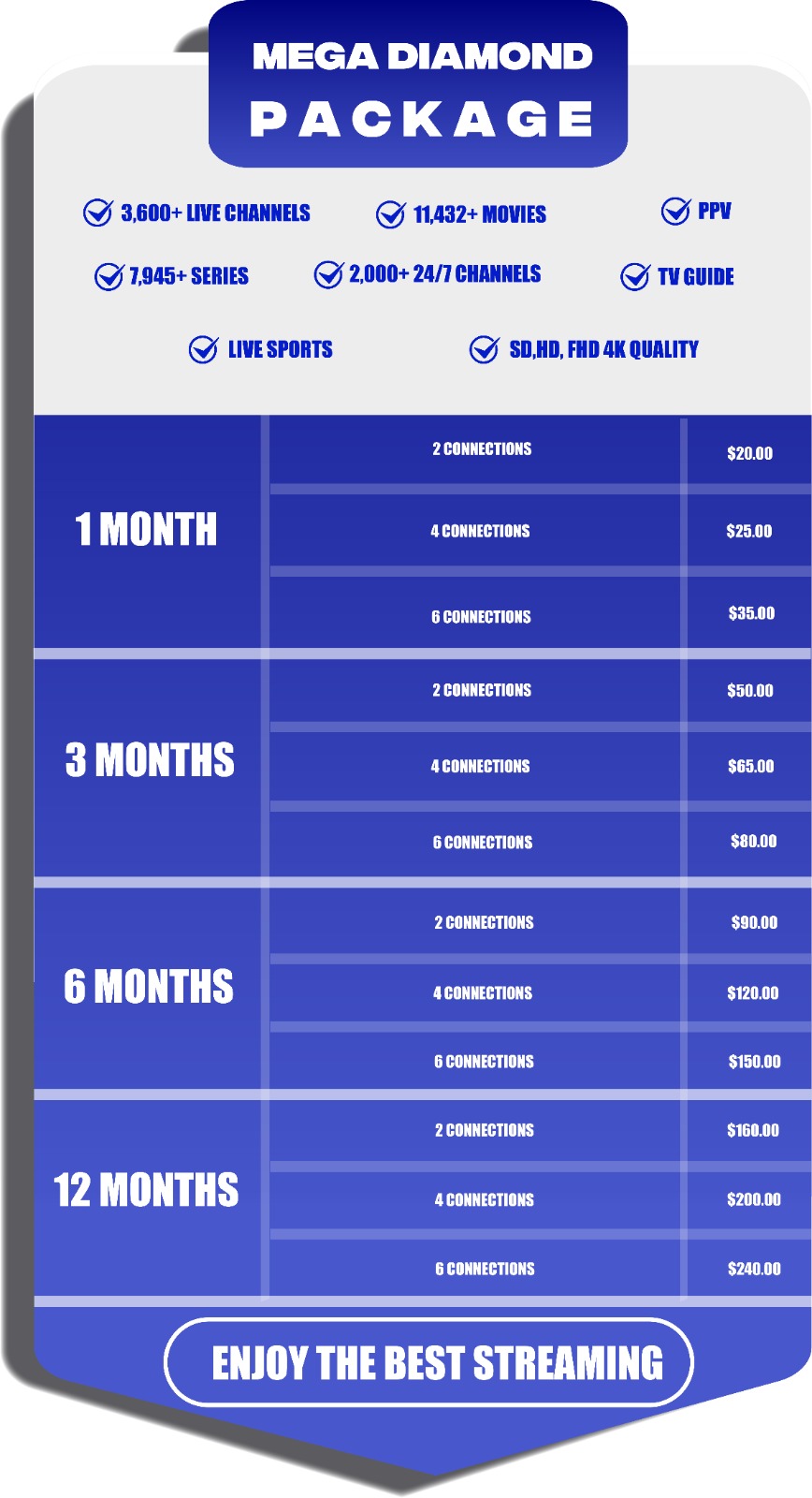 ATTENTION MEGA DIAMOND SUBSCRIBERS BEGINNING AT 0001AM EST ON JANUARY 1ST, 2025 ALL NEW SUBSCRIPTIONS AND RENEWALS PRICES ARE AS FOLLOWS AND WE ARE NOW OFFERING SIX CONNECTIONS: